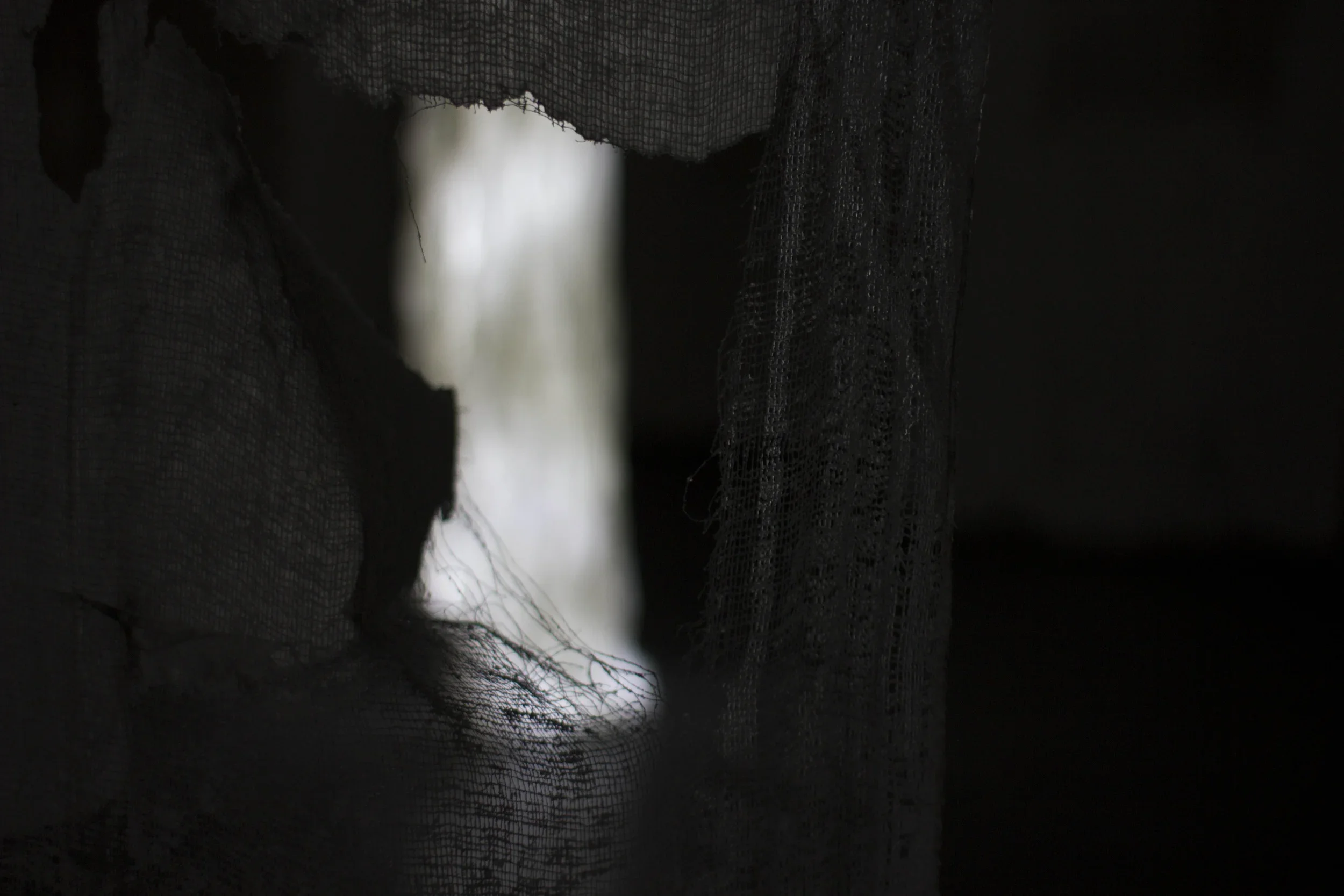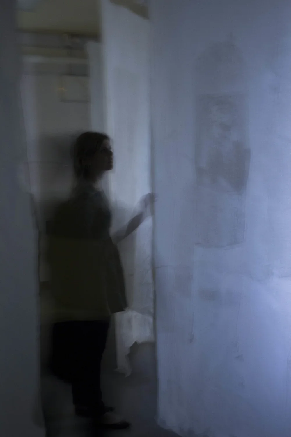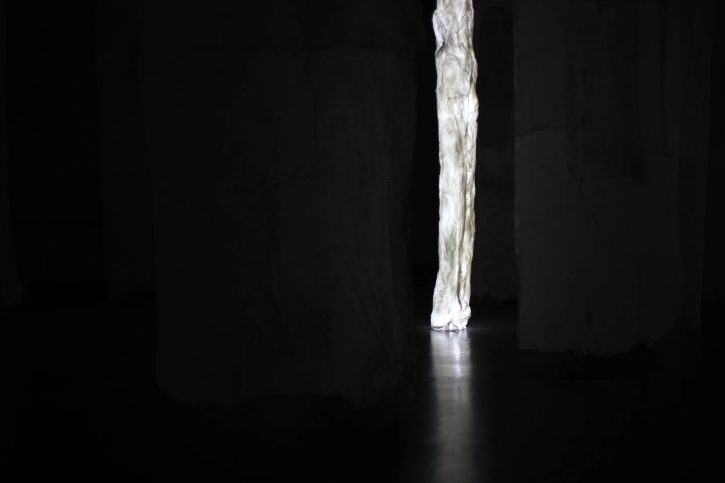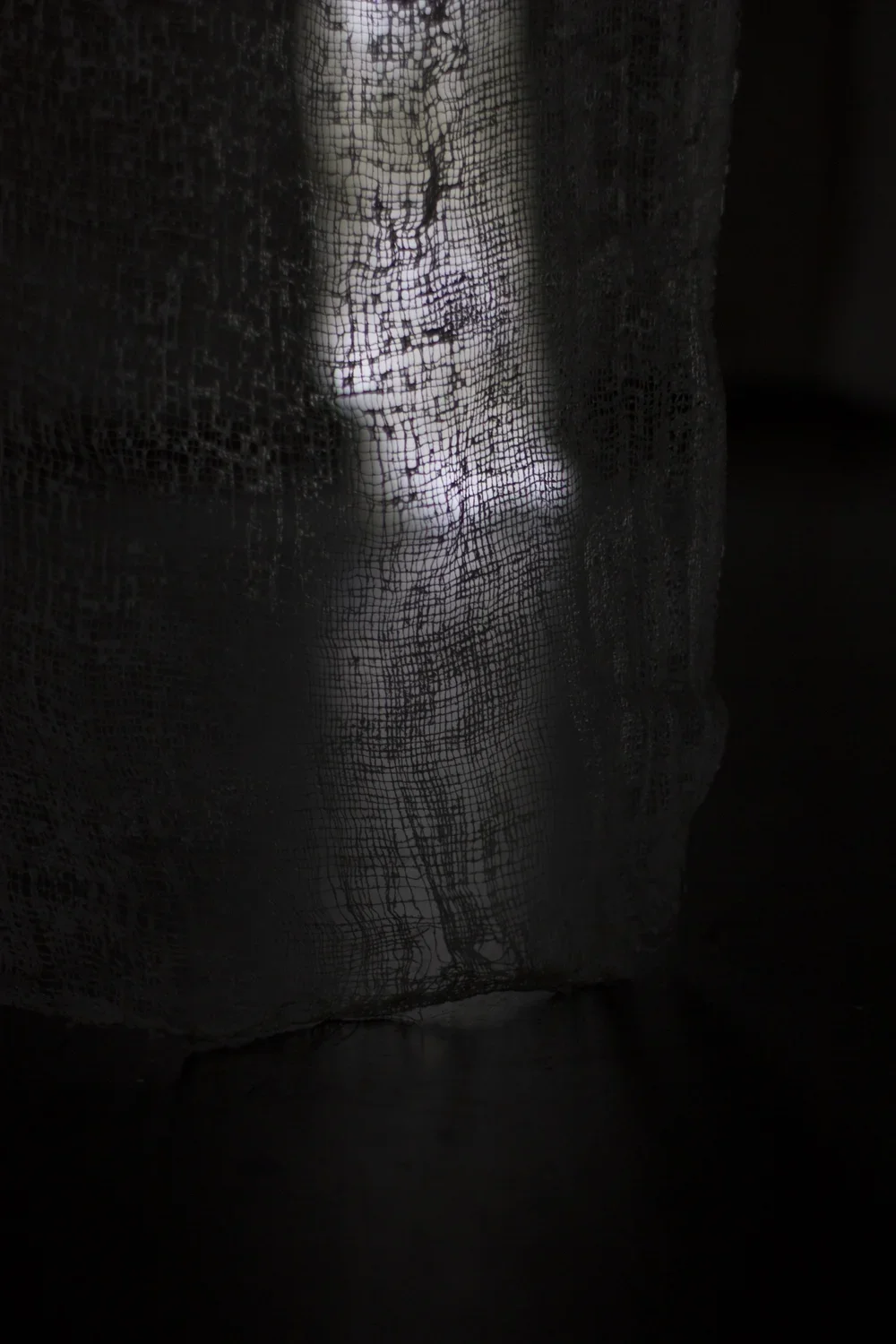 2013 Cheesecloth, wax paper, textile stiffening medium, clear plastic line, graphite, LED rope light and plaster cast. The Presence of Absence
