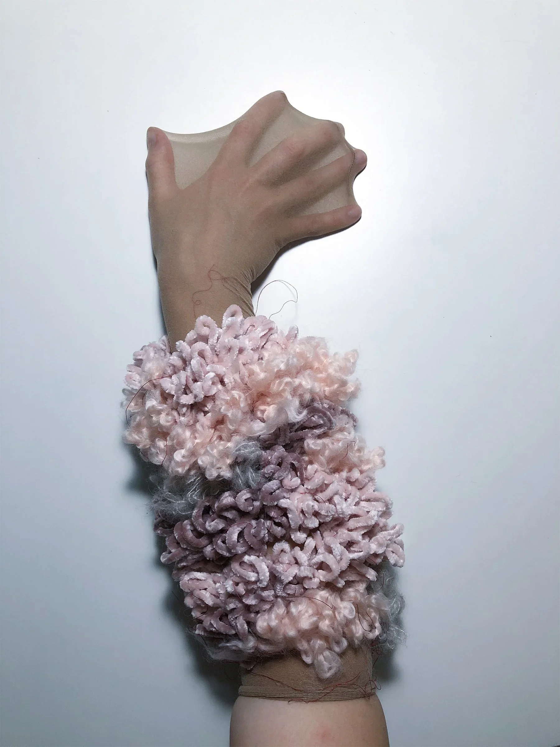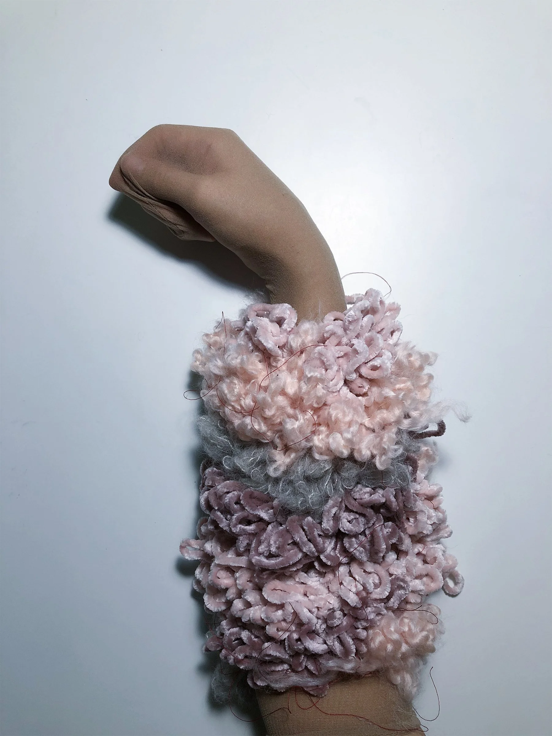 I start sewing at the dining room table while my child naps. As I sew the fabric stretches and tears. A piece of yarn pokes through. My hands hold the yarn in place methodically looping back and forth. The same action repeated tirelessly, mindlessly. I sit and loop. I slide my hand through the stocking as the fabric calls to be inspected. My body becomes the piece. The yarn gently moves as I twist my wrist changing form, adapting to the imposed stress of movement. The loose threads find their place after each sway. My child cries, and my body responds.